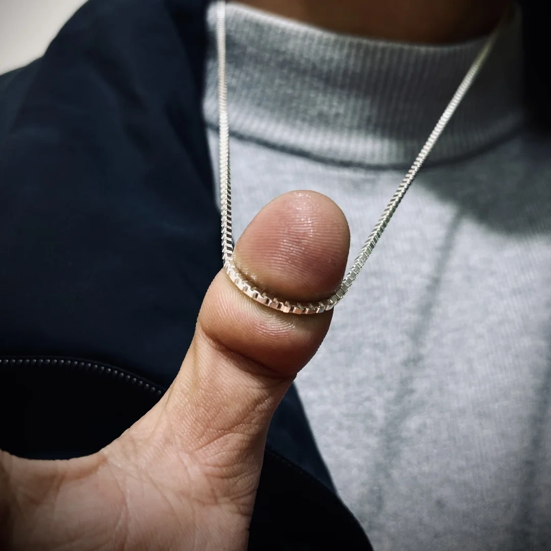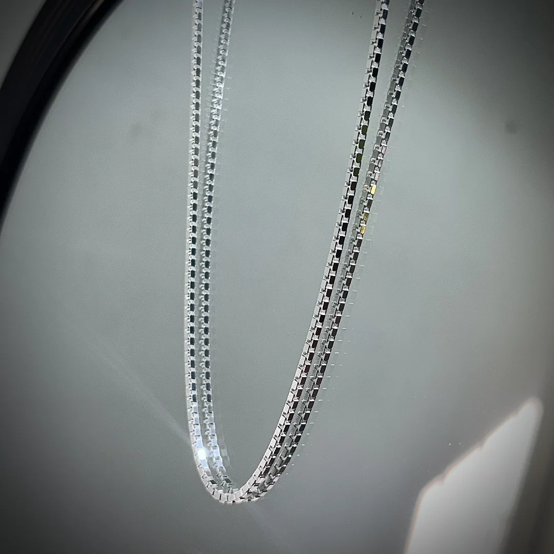 Crafted from pure 925 sterling silver, the Square Box Chain features a sleek, geometric design with interlocking box-shaped links, offering durability and a refined look. A timeless addition to any collection, this chain complements both casual and formal styles effortlessly.