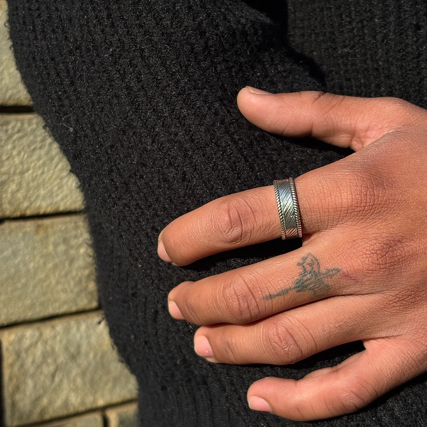 A fusion of industrial edge and artisan craftsmanship, this wire gripped ring is a versatile staple for any collection. Forged from high-quality 925 Pure Silver, it features a central panel of diagonal etched grooves framed by intricate, rope-style braided borders.
