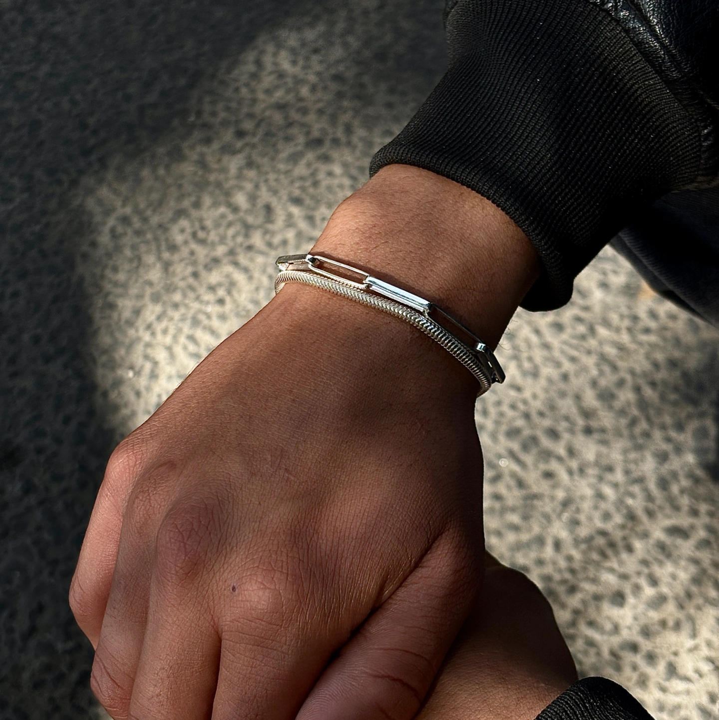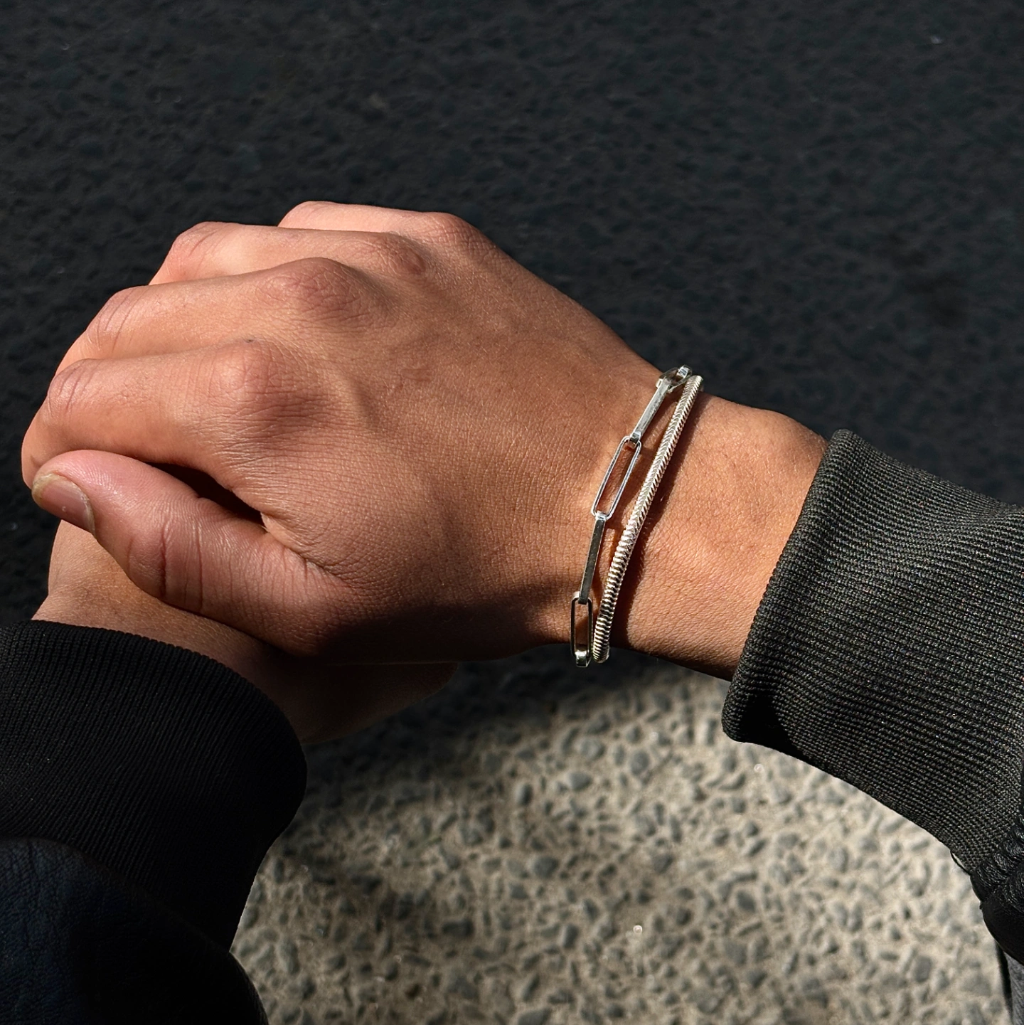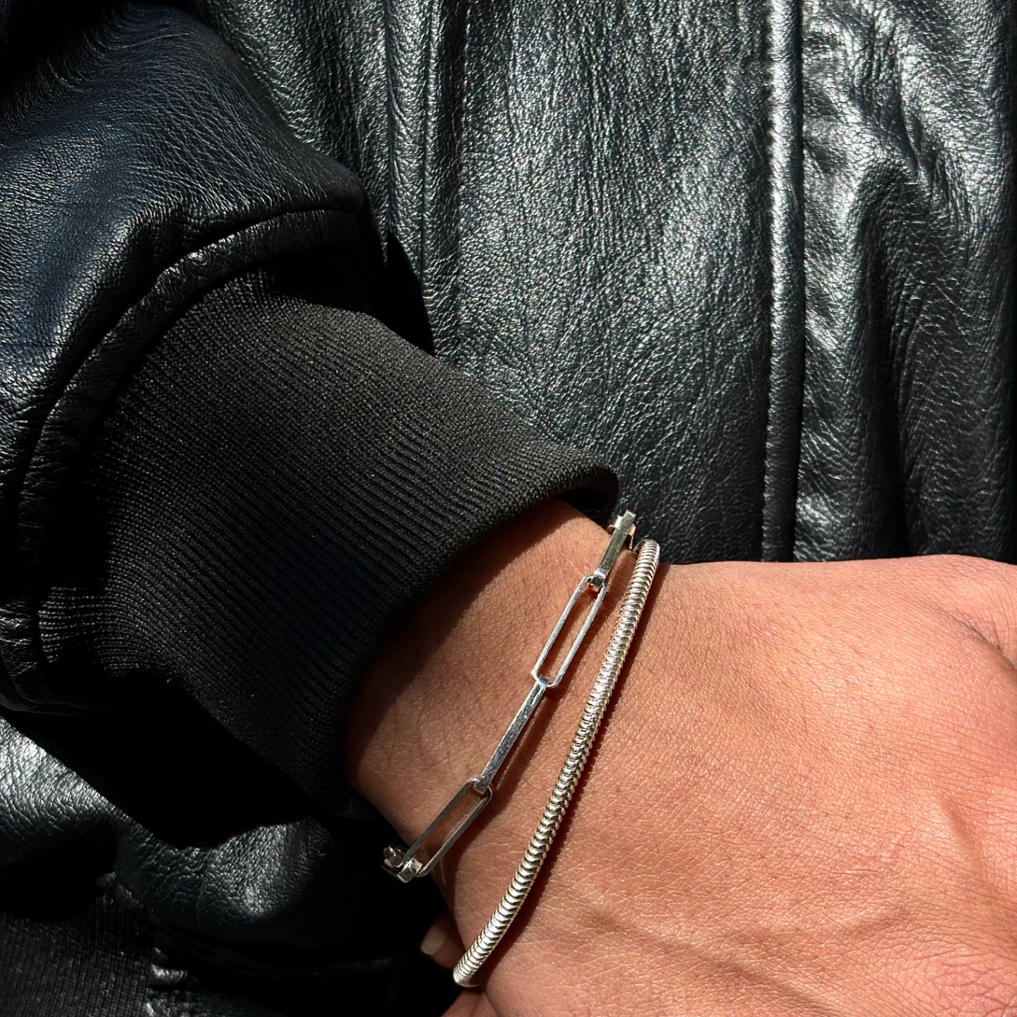 This bracelet is a captivating piece that fuses two distinct, yet highly fashionable, chain styles: the Paperclip Chain and the Snake Chain (or a single snake charm). It represents a modern trend of blending contrasting textures and classic symbolism into one unique accessory.